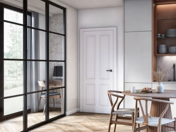Ramiak drewniany z 3 warstwowym systemem malowania w bogatej kolorystyce RAL i NCS z profilowaną ramką wystrojową w kolorze skrzydła ze stabilnym wypełnieniem z płyty otworowej.
