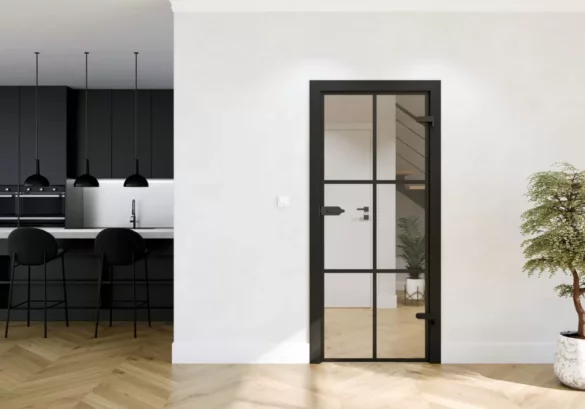 wykonane ze szkła hartowanego do wyboru z szybą ryflowaną lub przezroczystą ze szprosami. Montować je można i jako drzwi rozwierne i przesuwne.